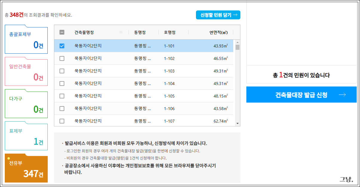 저는 비회원으로 로그인 했기 때문에, 전유부 한 건을 선택한 후 [건축물대장 발급 신청]을 클릭하겠습니다.