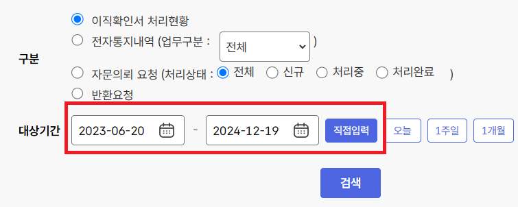 저는 2024년 12월 19일 기준으로 1년 6개월 이전인 2023년 6월 20일로 설정한 뒤 검색을 클릭해 보겠습니다.