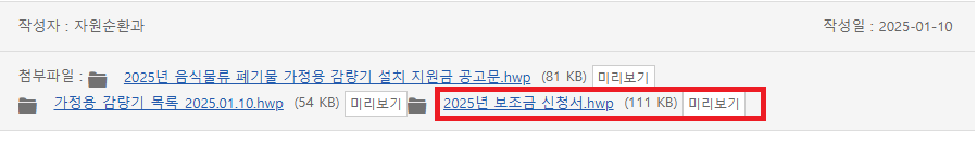 상단 링크 접속 후, [2025년 보조금 신청서.hwp] 파일을 다운로드 받으면 모든 제출 서류를 확인할 수 있습니다.