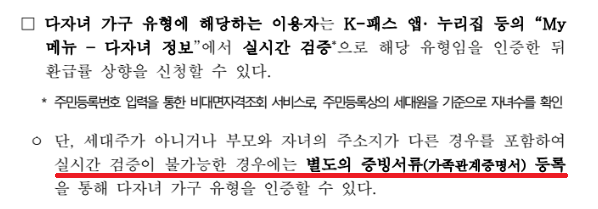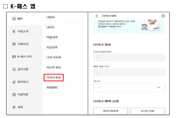 - [K패스 어플 접속] – [MY 탭] – [다자녀 정보]