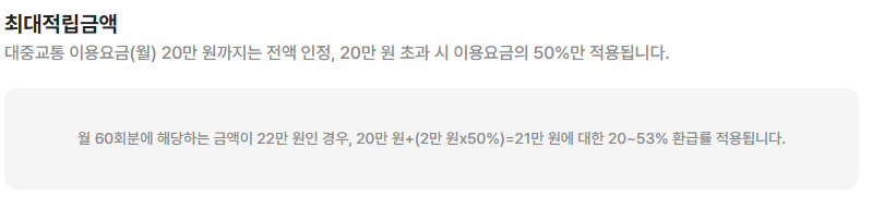 | 기본 혜택 | 월 15회 이상 대중교통 이용 시, 월 최대 60회까지 교통비의 20%를 현금으로 환급. |
