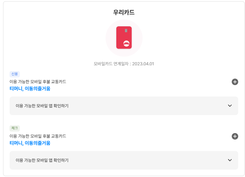 예를 들어, 우리카드의 경우 신용카드와 체크카드 모두 티머니와 이즐 교통카드로 등록 가능. 단, 체크카드는 소액신용한도 등록이 필요합니다.